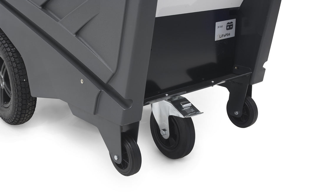 • Els dos contenidors de residus de 70 l cadascun i dotats de nanses laterals ergonòmiques ofereixen una elevada capacitat de càrrega i de recollida de residus. Es poden utilitzar amb o sense bosses estàndards de plàstic d'un sol ús. Són fàcils i ràpids de treure per buidar-los, operació que no requereix cap esforç físic per part de loperador.